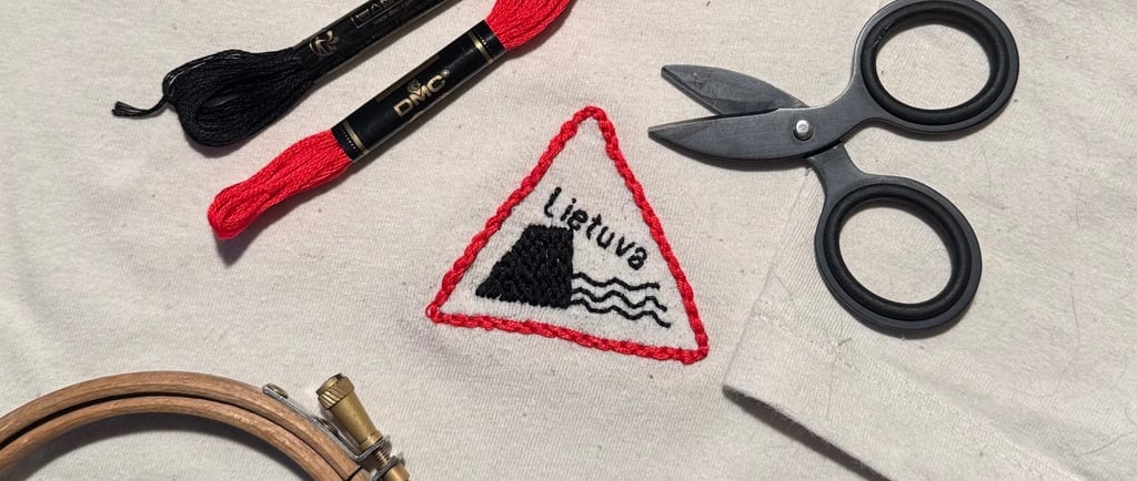 Jau rašiau apie tai kokius siūlus siūlau rinktis, dabar dėmesys storiui. Muline siūlai sudaryti iš 6 gijų. 6 gijomis siuvinėtas raudonas ženklo apvadas (du kartus dygsniuota aplink perimetrą) bei juodos platformos užpildas. Tekstui ir bangelėms naudojau 2-3 gijas.