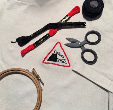 Adata, žirklės, siuvinėjimo lankelis, eskizo perkėlimo priemonė (žr. toliau), gaminys ant kurio ketinate siuvinėti (marškinėliai, drobinis maišelis ar kt.) bei siūlai. Su siūlais galite eksperimentuoti, mėginti siuvinėti su tuo ką turite. Aš pasirinkau DMC muline tipo raudoną (666) bei juodą (310) siūlus. Daugiau apie įvairias siuvinėjimo priemones rašiau čia.
